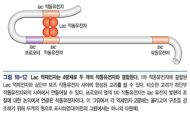 - 이 결합을 위해 활성결합자리와 프로모터 사이의 DNA가 고리를 형성 → 상호 결합 용이