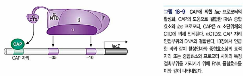 - 활성증진부위가 없는 lac프로모터에서 α-CTD는 CAP 단백질과 부근의 DNA에 결합.(DNA 큰홈이 인식하도록 도움을 줌)