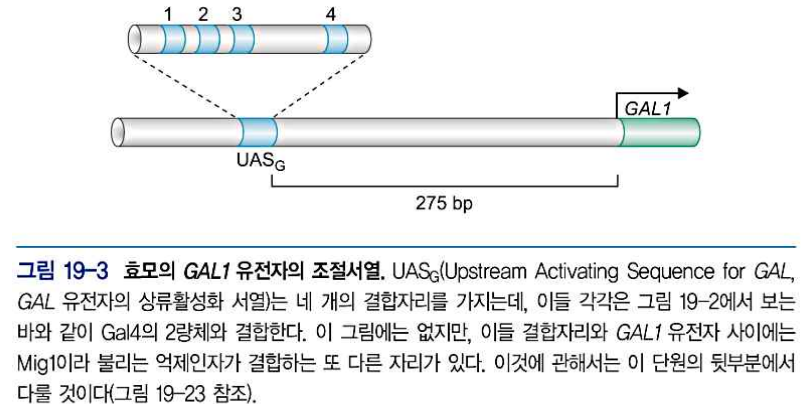 - 효모 활성인자 Gal4 : lactose 분해 유전자 활성화. GAL1 유전자 전사를 1000배 활성화 (GAL1 상류의 UASG에 결합시)