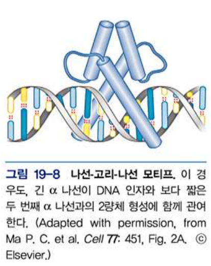 - 여기도 DNA는 α나선을 큰홈에 삽입하는 방식으로 인지 (아연함유 DNA결합영역을 가진 활성인자의 α나선)