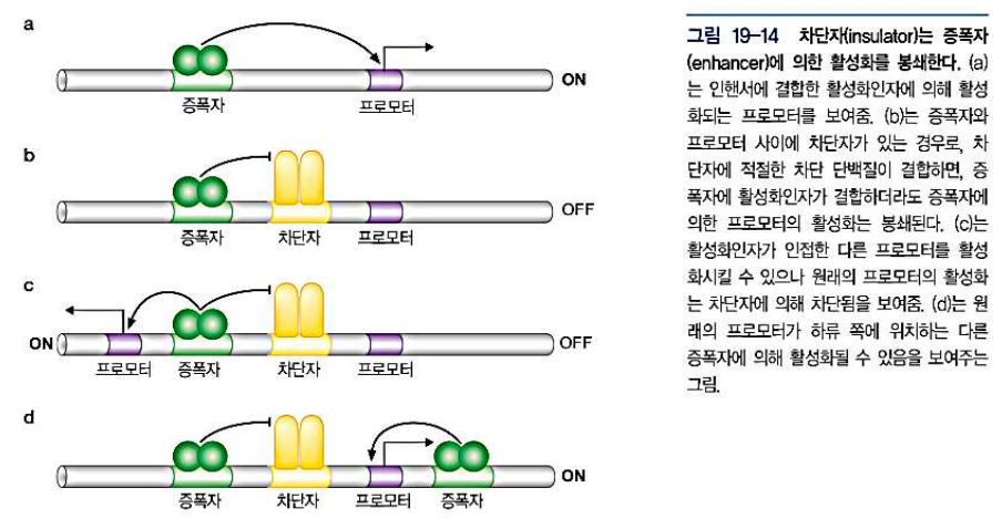 - 차단자는 염색질 변화가 확산되는 것을 억제 (염색질의 국부적 상태변화는 유전자 발현여부에 영향을 주기 때문)