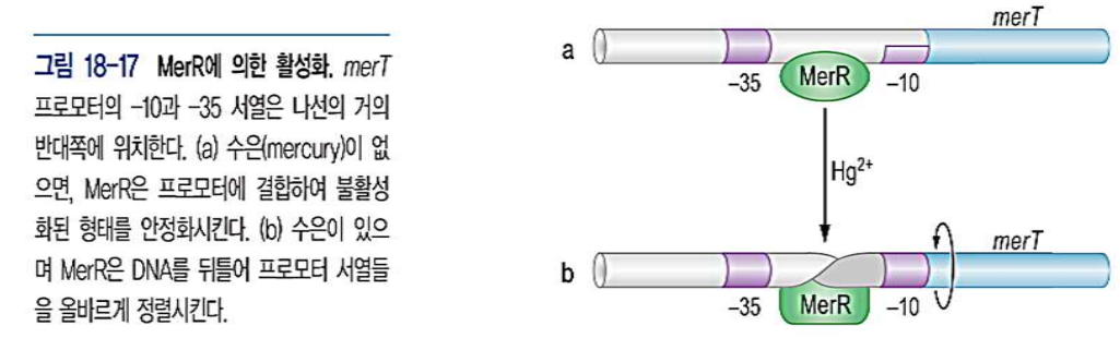 - MerR이 수은에 결합하면 MerR 전사활성인자는 DNA 프로모터의 중심이 비틀어져 형태적 변화